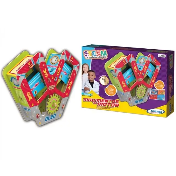O brinquedo educativo da Linha Steam Movimentos do Motor da Xaingo Brinquedos contém 76 peças e possibilita a montagem de um motor em madeira reflorestada através do encaixe de suas peças.