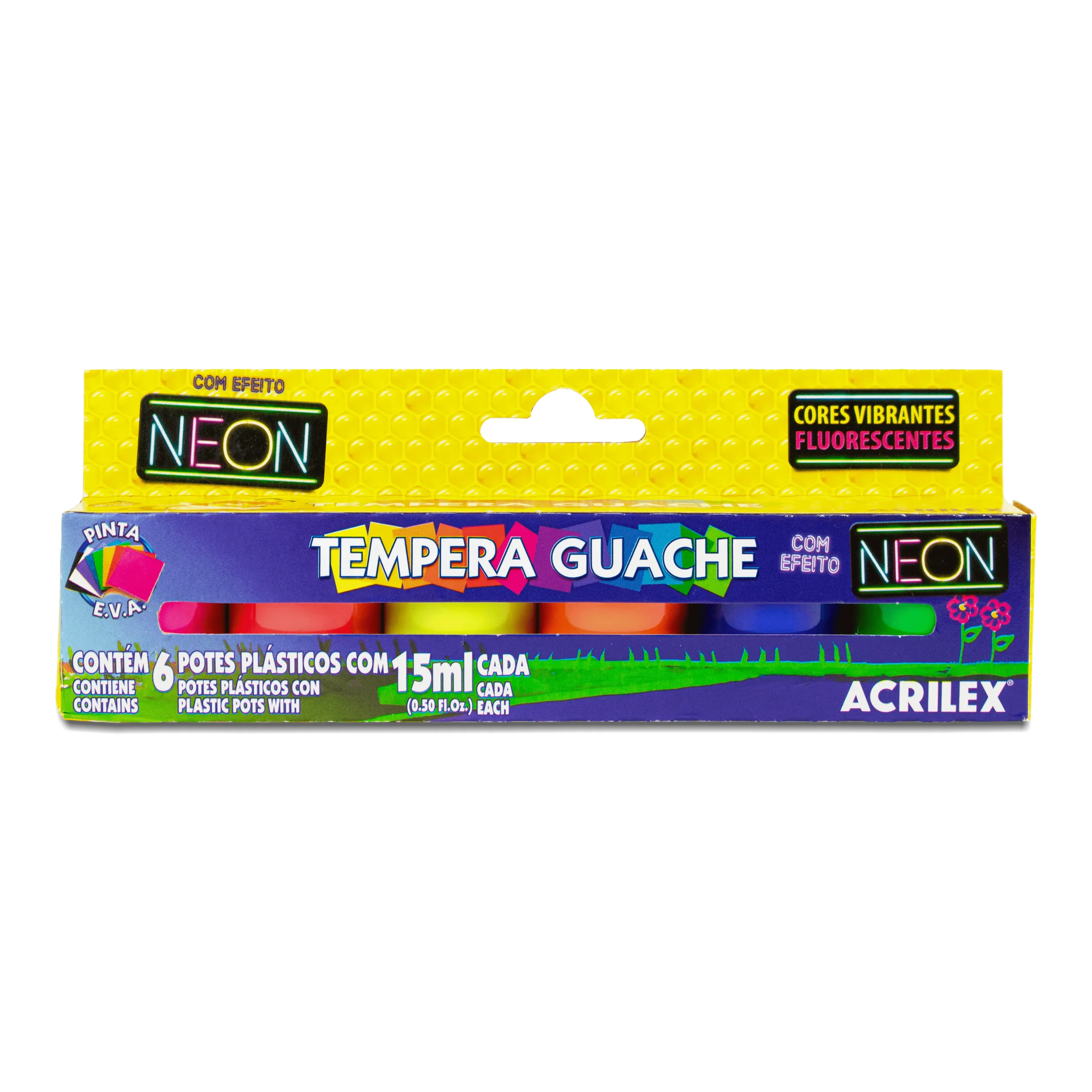 – Com 6 cores de 15 ml cada. – Com efeito neon, as cores são vibrantes e fluorescentes. – Para trabalhos artísticos e escolares. – Pode ser aplicada em papel, papel cartão, cartolina, gesso, madeira, cerâmica e E.V.A.