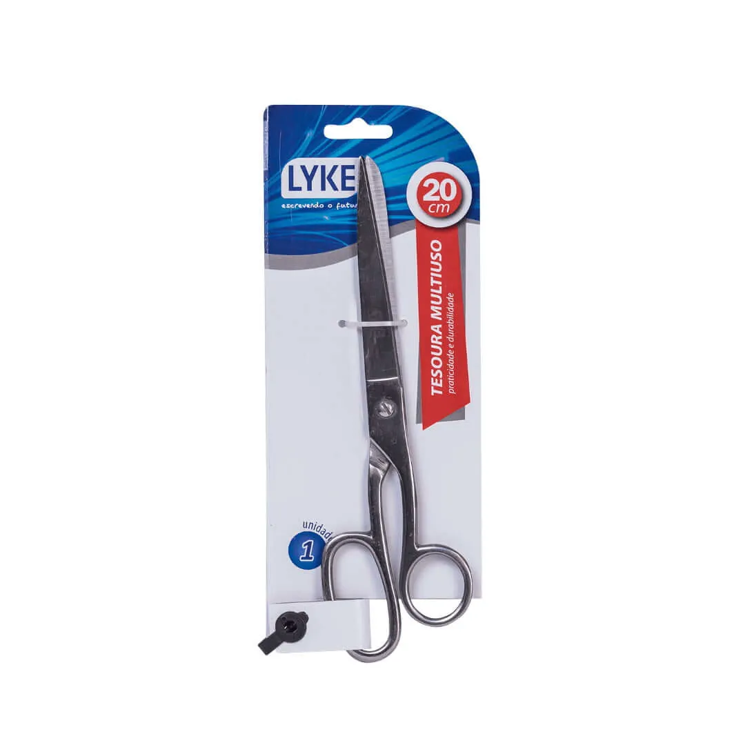 Tesoura Multiuso LYKE de 20 cm é fabricada com matérias de qualidade, que garantem segurança necessária para realização de artesanatos, costuras e de projetos profissionais.