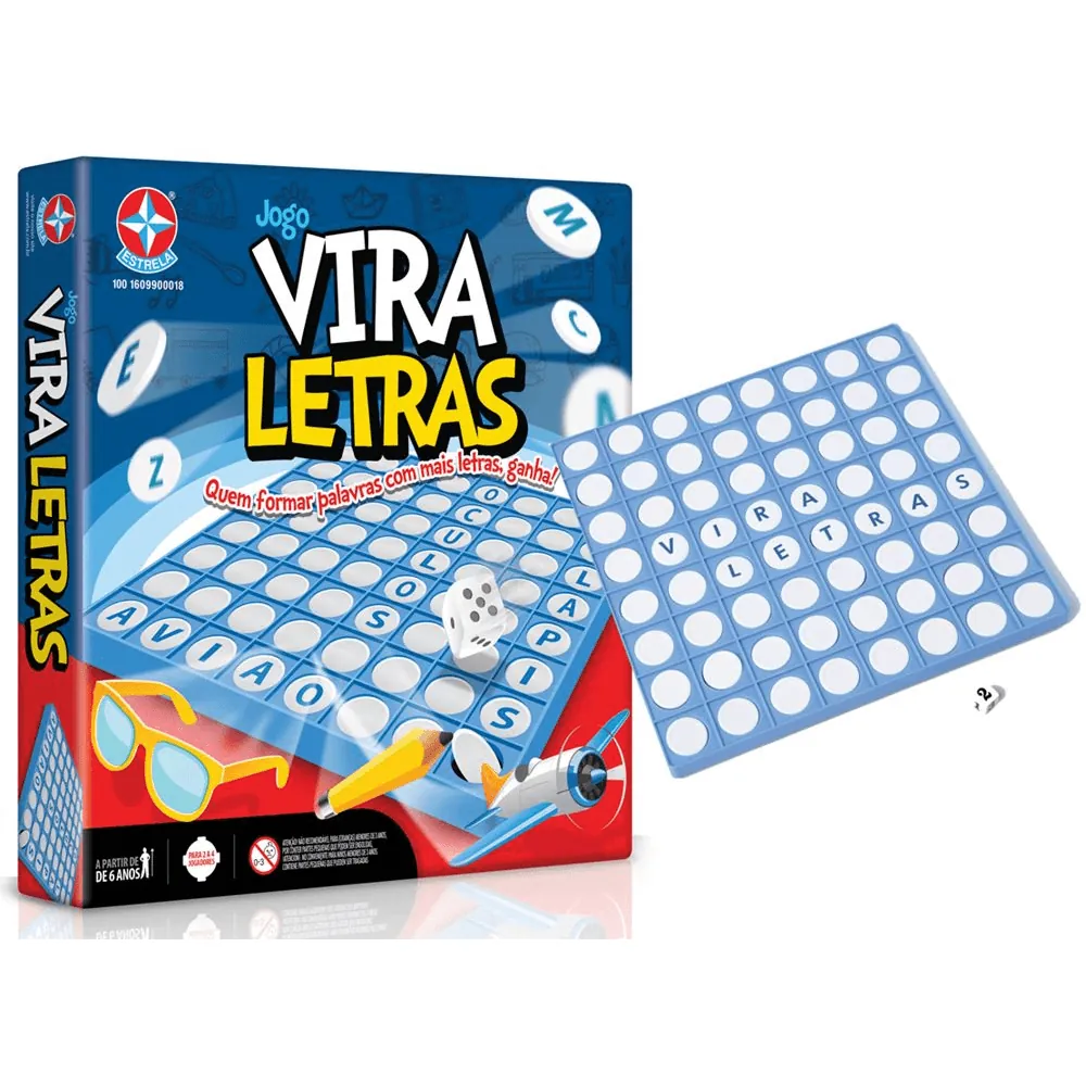 VIRA LETRAS – ESTRELA CONTÉM: 64 discos de letras, 1 tabuleiro e 1 dado.